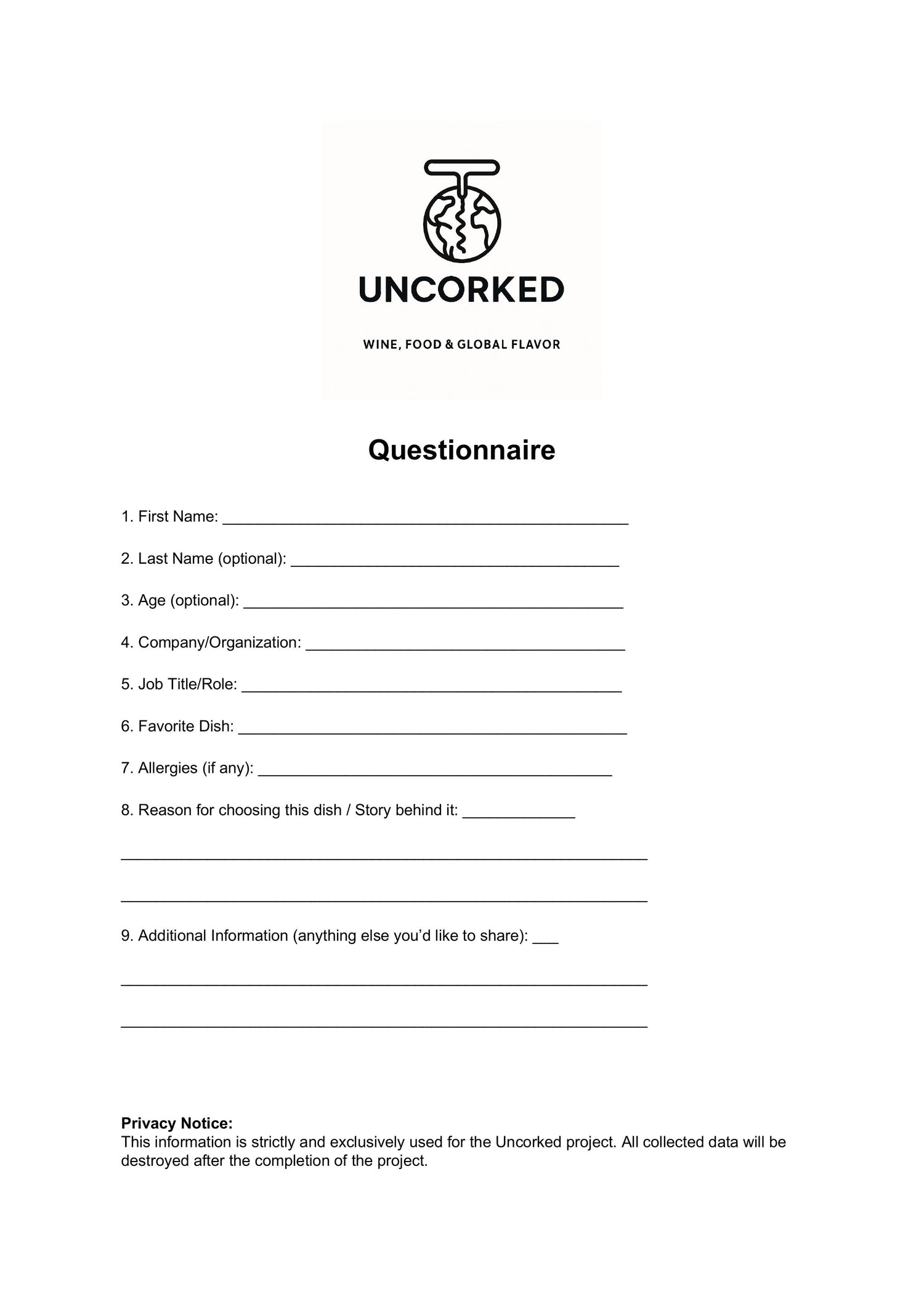 We kindly ask you to fill in this short questionnaire. By sharing your favorite dish, the story behind it, and some personal details, we will create a personalized recipe that reflects your taste and preferences.